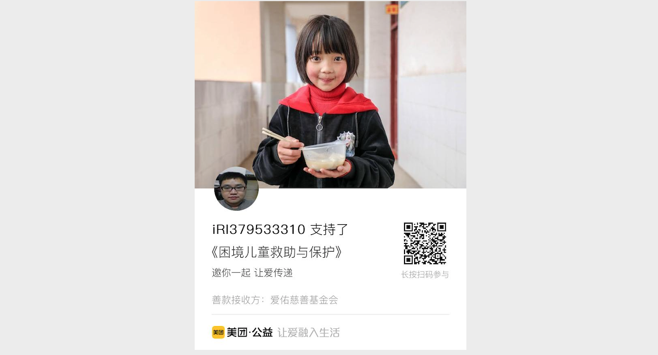 近期收到的打赏通过美团公益捐赠给有需要的人。