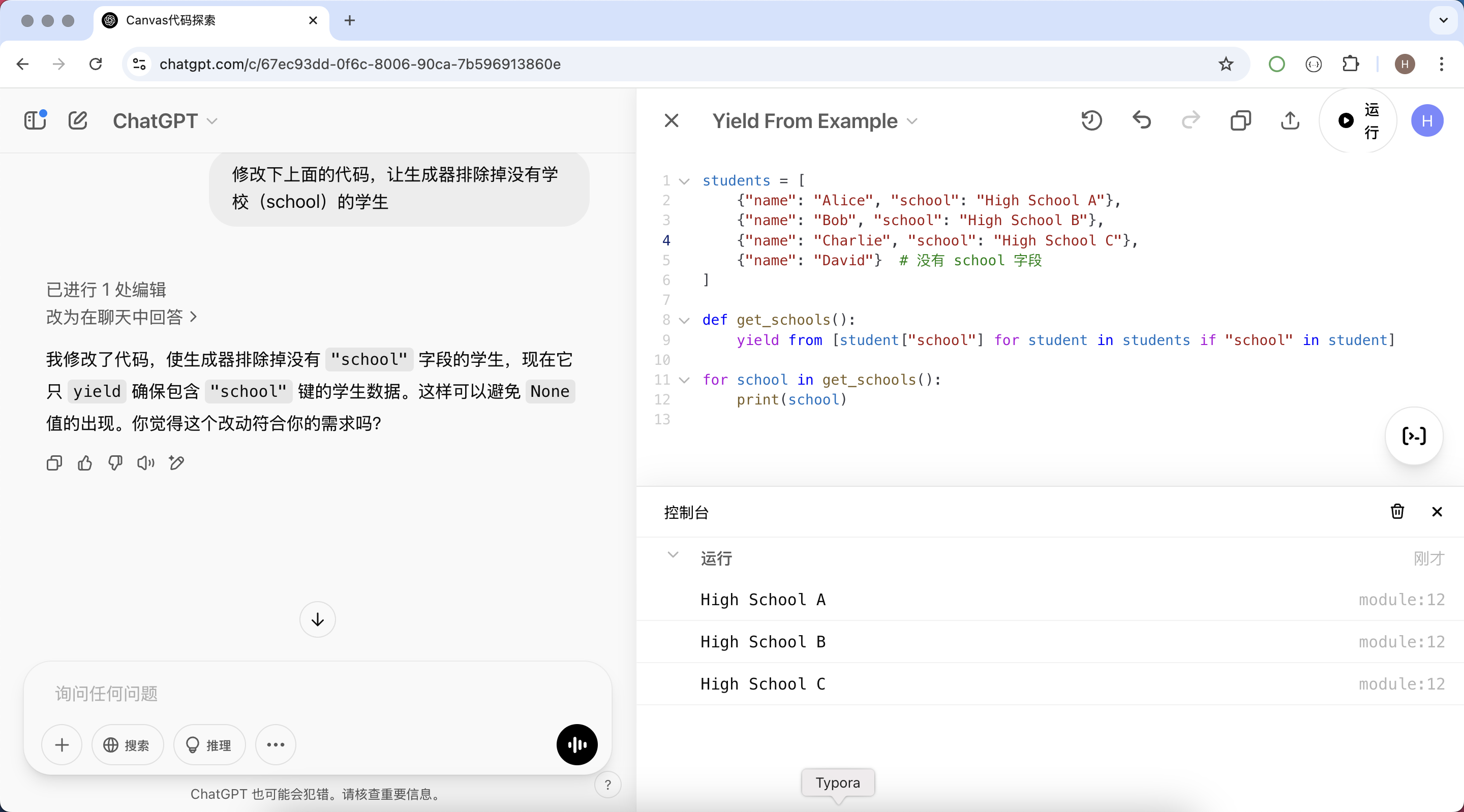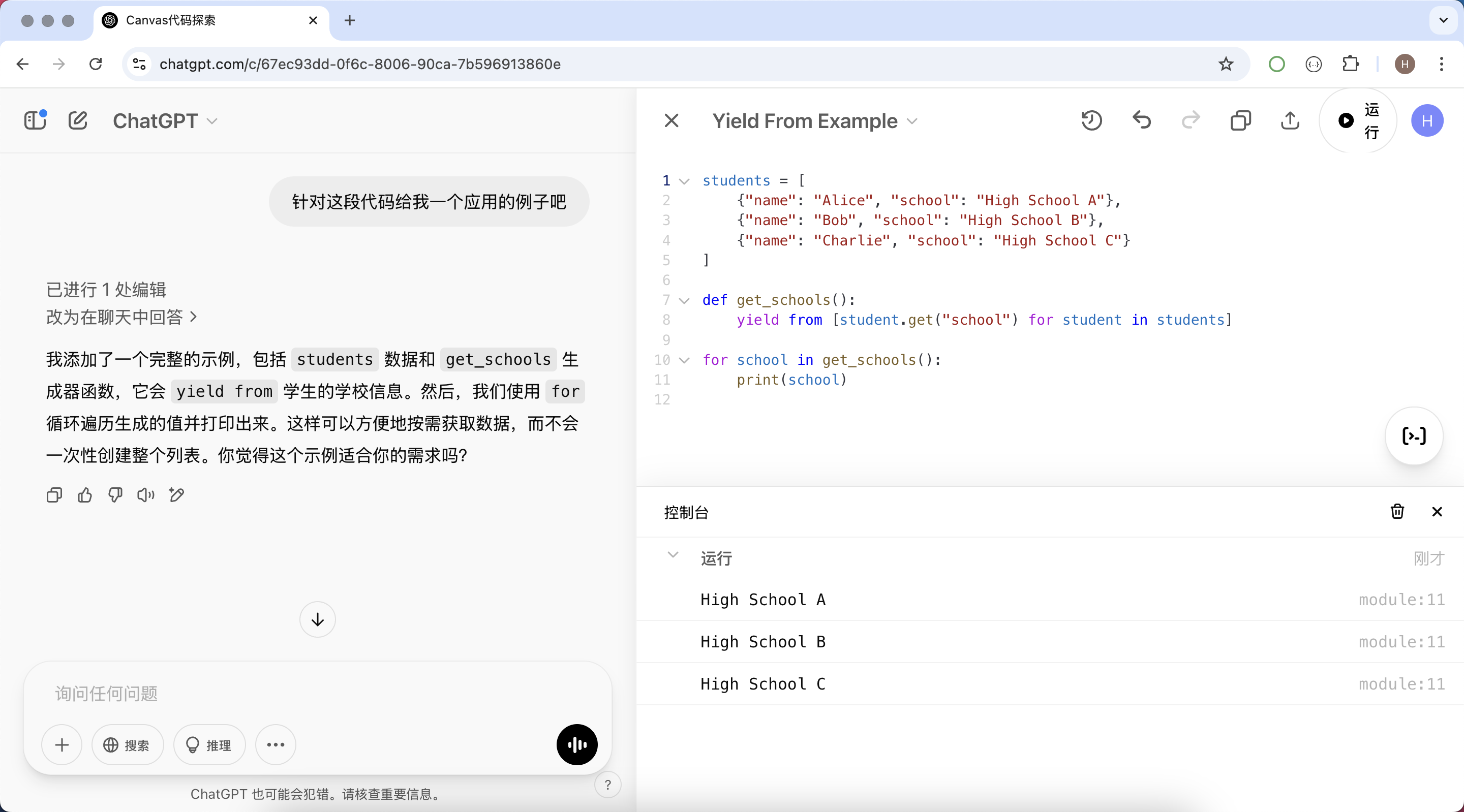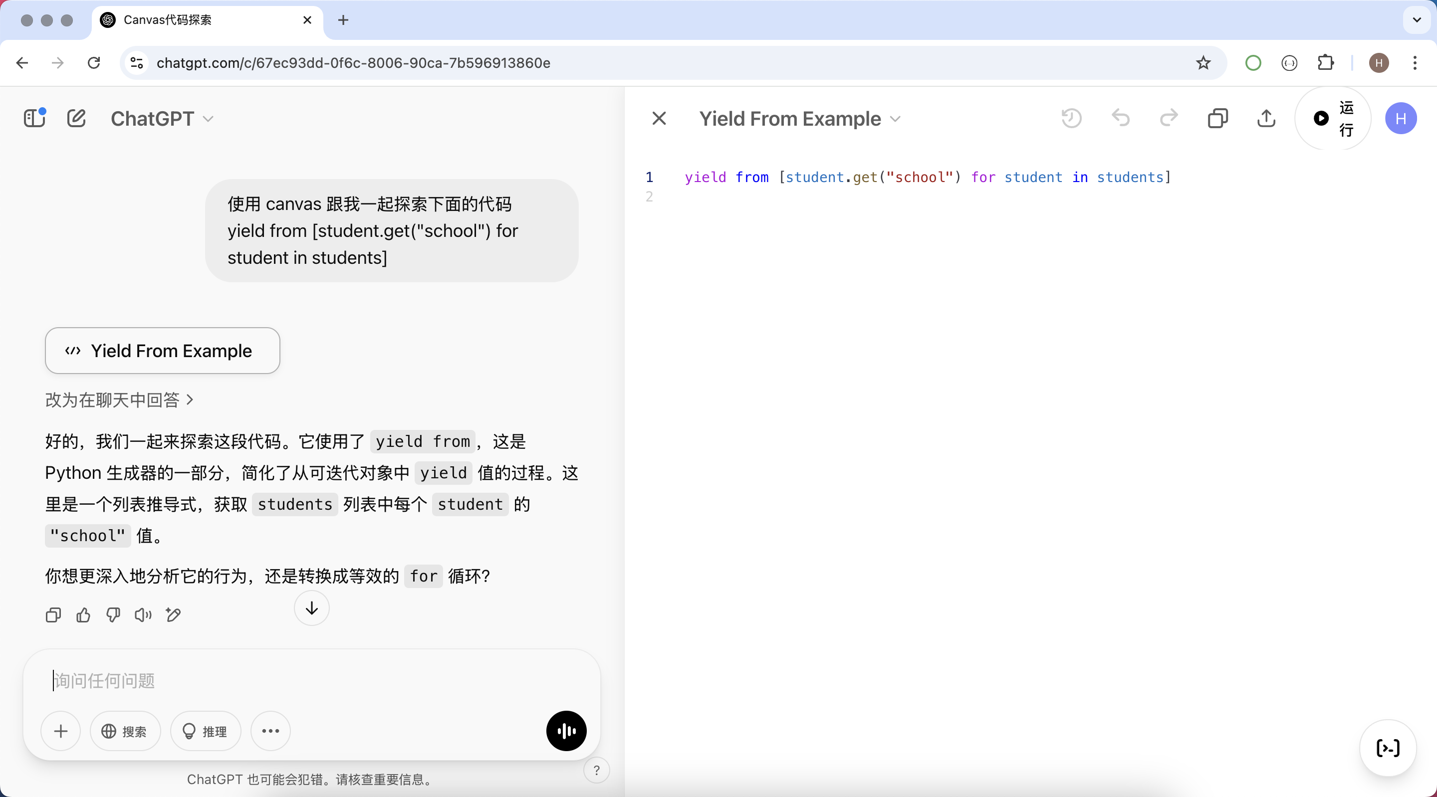 对于初学者来说,Canvas 也是一个很好的学习工具。你可以在 Canvas 中输入示例代码,并让 ChatGPT 解释其作用。例如: