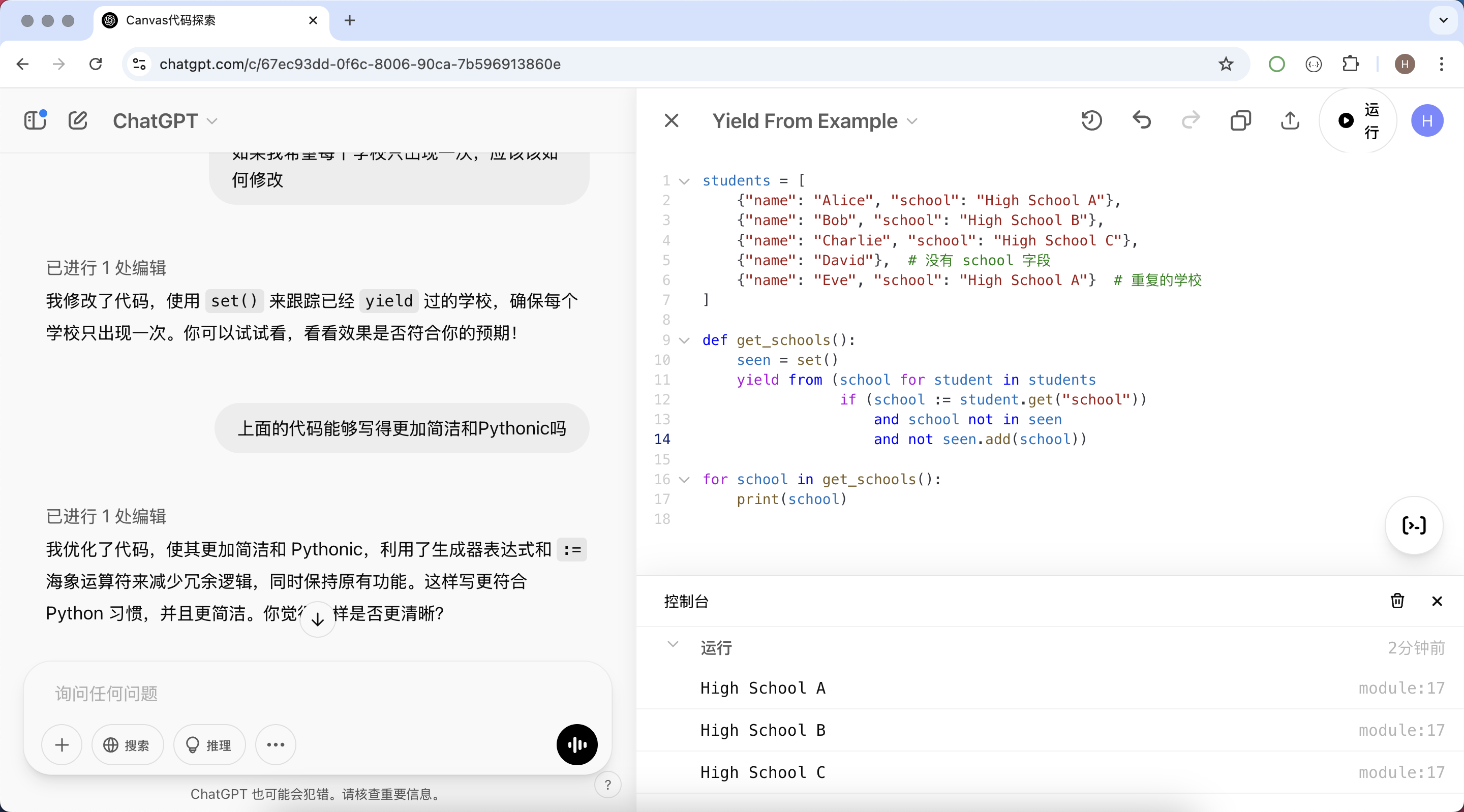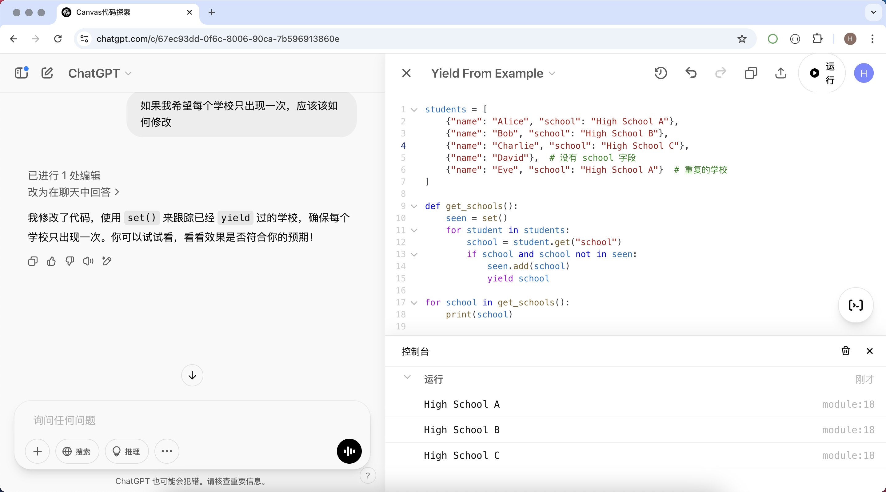 如下图所示,ChatGPT 给出了关于上面代码的回复,右侧展开了 Canvas 并将我们的代码置于其中。