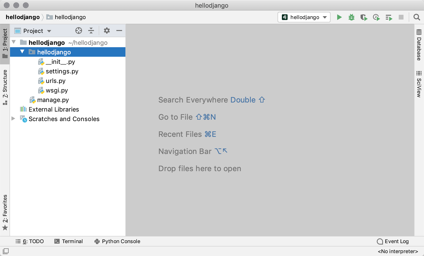 django-admin命令创建Django项目(项目名称为hellodjango)。