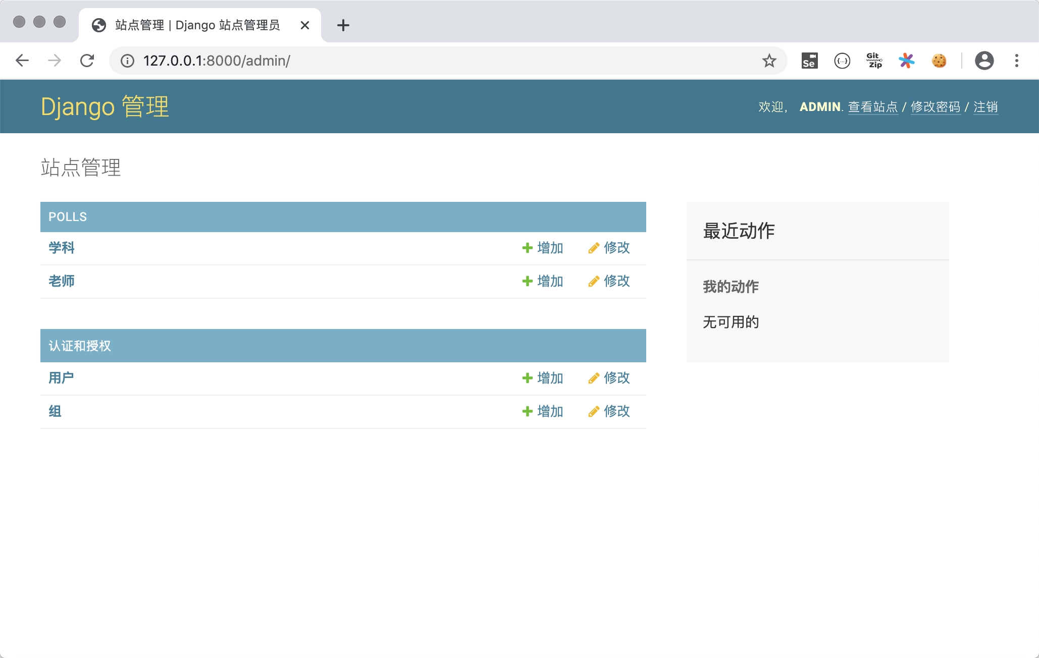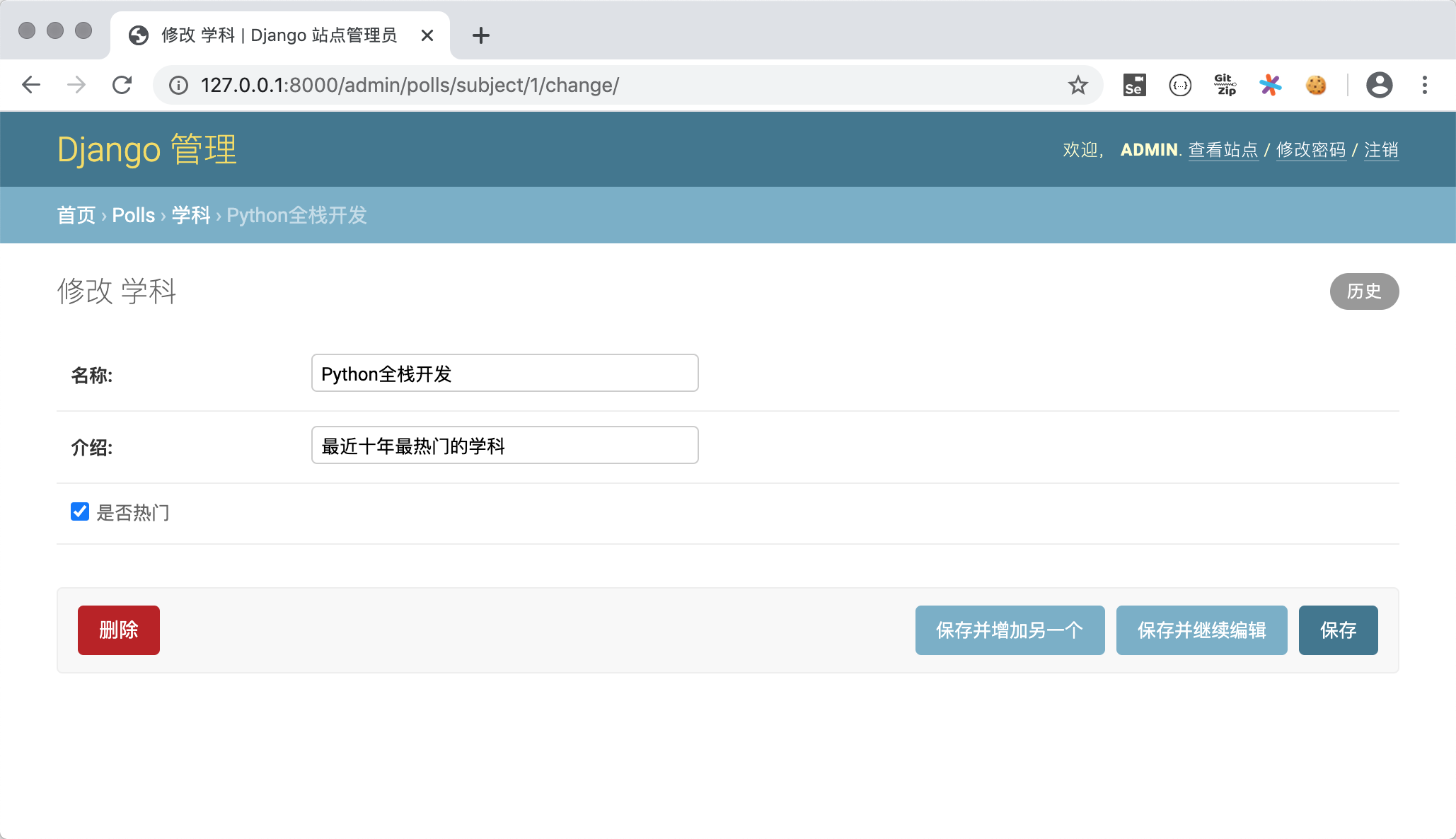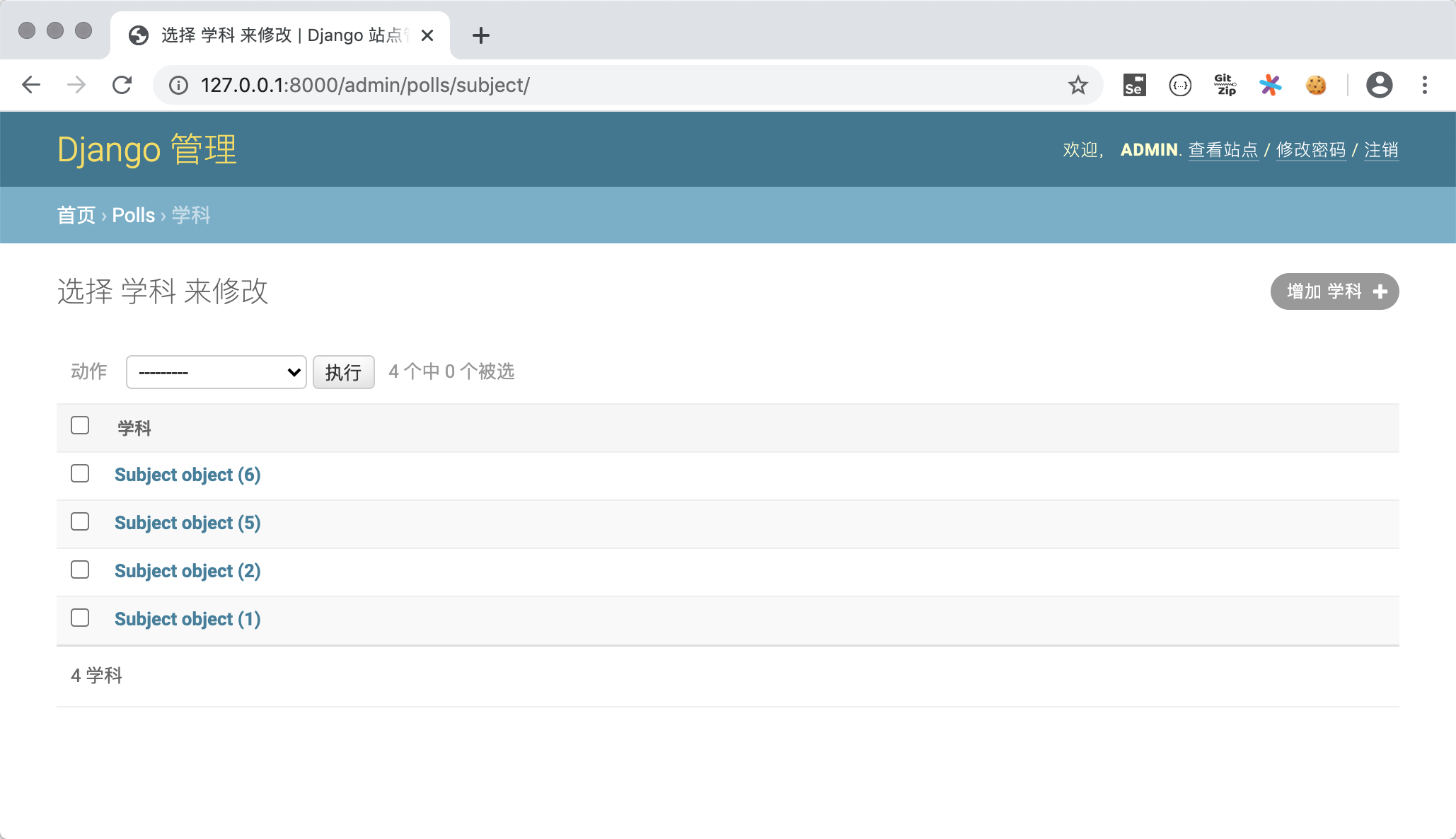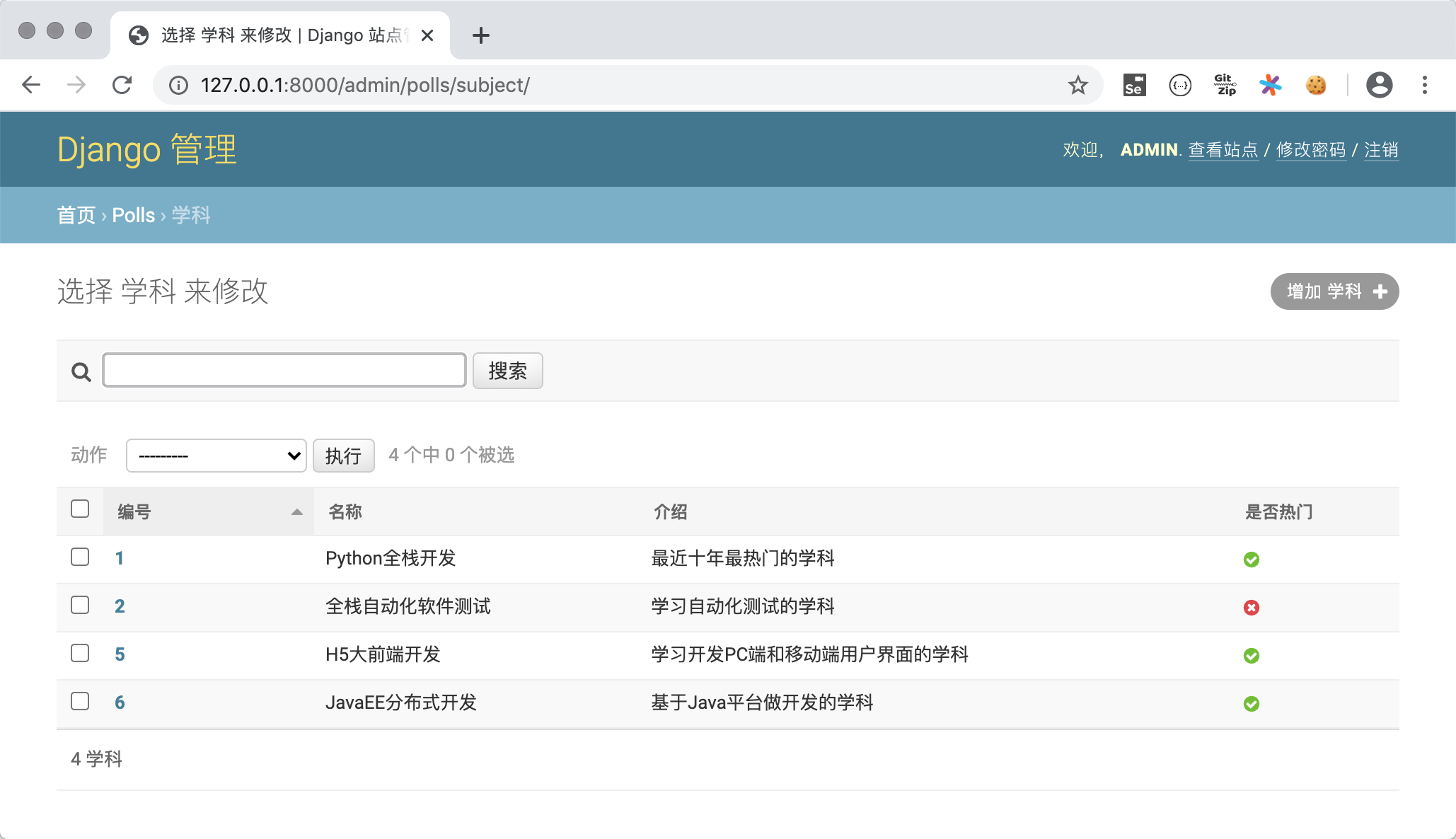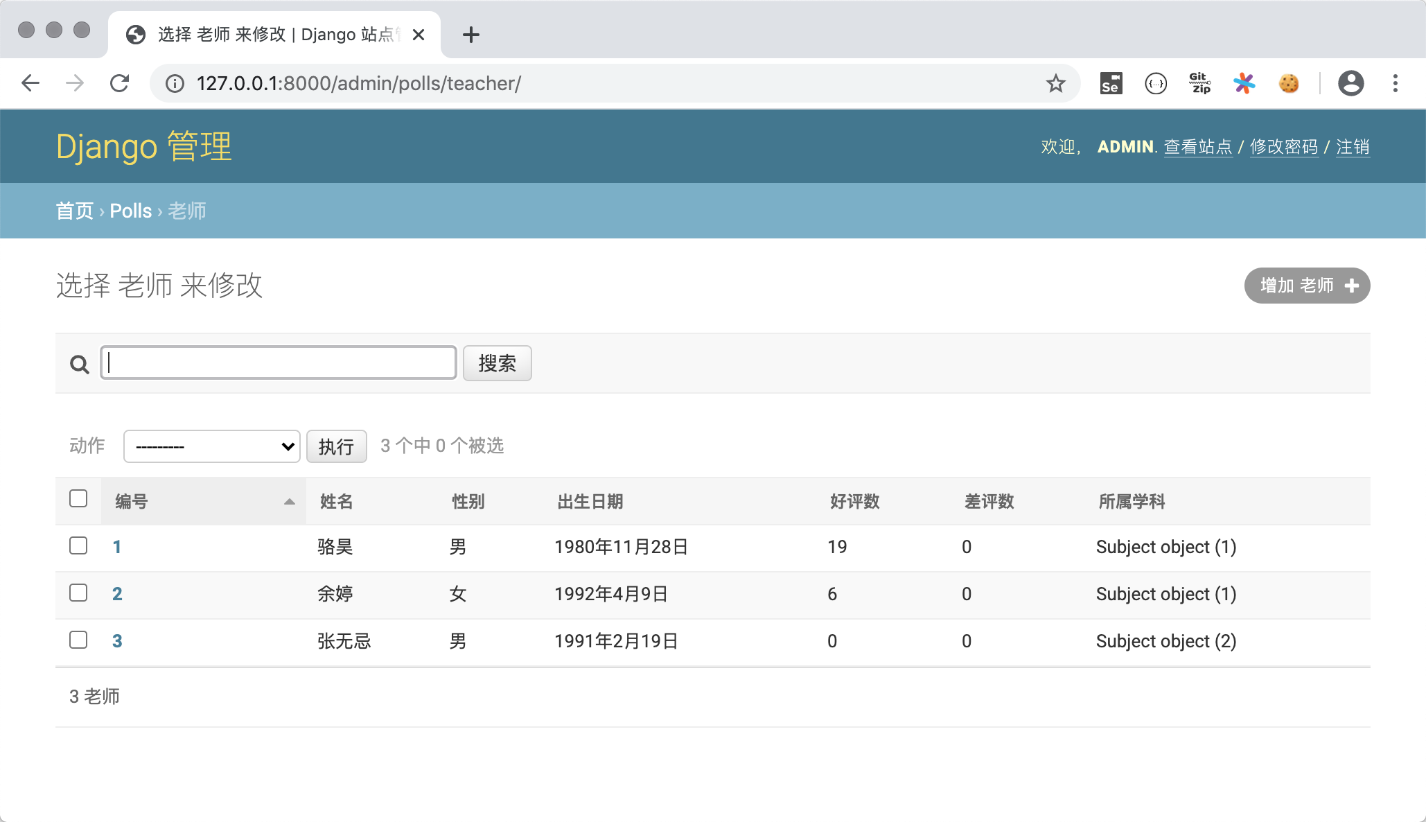 为了更好的查看模型,我们为Subject类添加__str__魔法方法,并在该方法中返回学科名字。这样在如上图所示的查看老师的页面上显示老师所属学科时,就不再是Subject object(1)这样晦涩的信息,而是学科的名称。