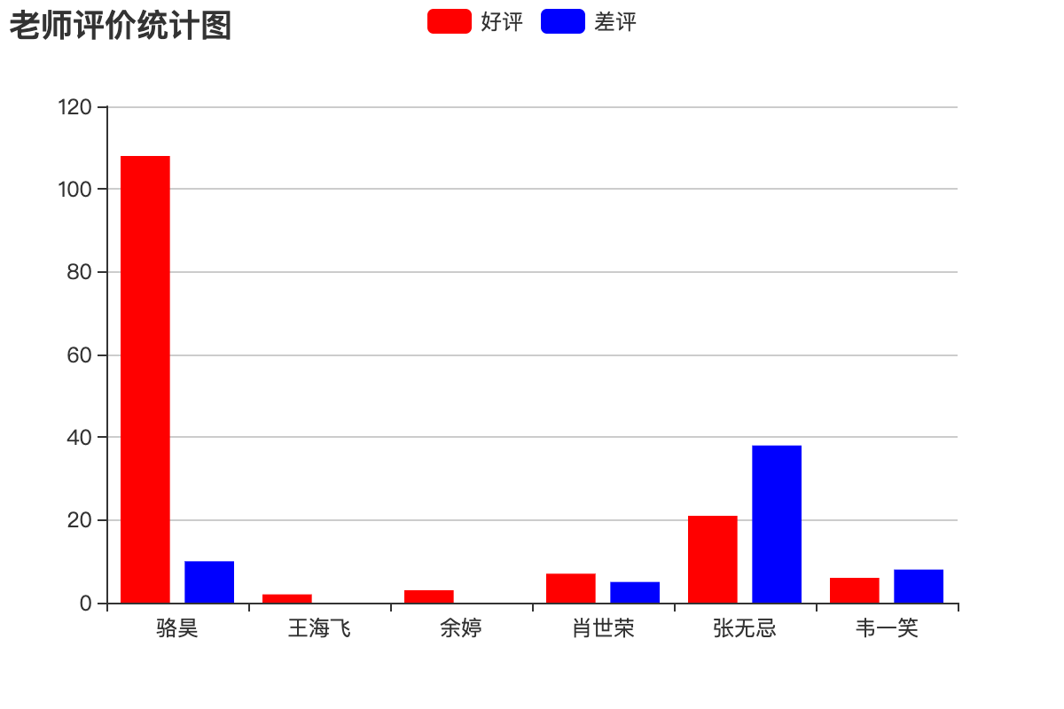 如果项目中需要生成前端统计图表,可以使用百度的ECharts。具体的做法是后端通过提供数据接口返回统计图表所需的数据,前端使用ECharts来渲染出柱状图、折线图、饼图、散点图等图表。例如我们要生成一个统计所有老师好评数和差评数的报表,可以按照下面的方式来做。