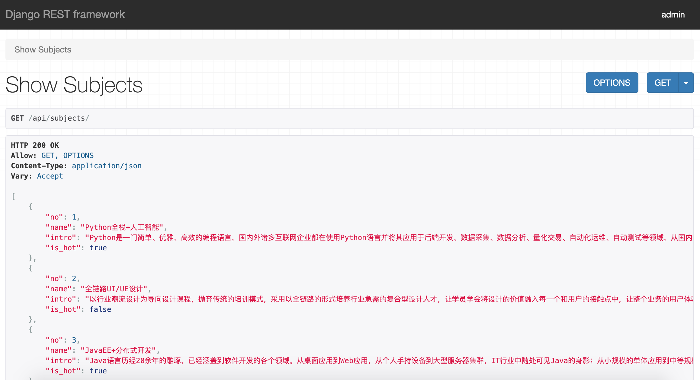 对比上一个章节的使用bpmapper实现模型序列化的代码,使用DRF的代码更加简单明了,而且DRF本身自带了一套页面,可以方便我们查看我们使用DRF定制的数据接口,如下图所示。