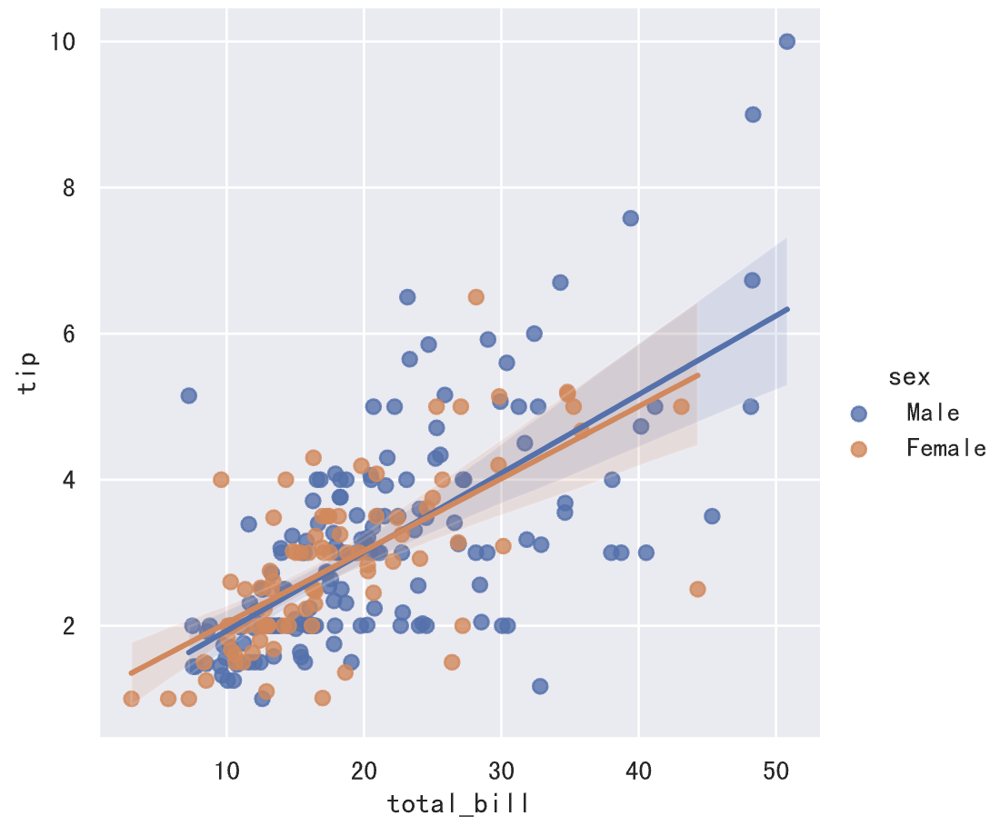 上面清晰的展示了,total_bill 和 tip 之间存在正相关关系,这一点我们也可以通过 DataFrame 对象的 corr 方法进行验证。接下来,我们可以建立回归模型来拟合这些数据点,而 seaborn 的线性回归模型图已经帮我们实现了这项功能,代码如下所示。