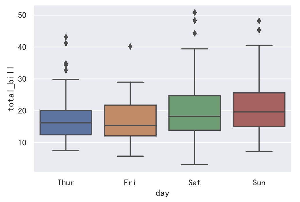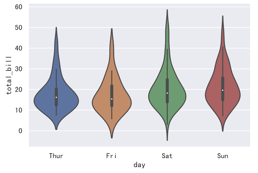 如果我们希望了解账单金额的集中和离散趋势,可以绘制箱线图或小提琴图,代码如下所示,我们将数据按星期四、星期五、星期六和星期天分别进行展示。