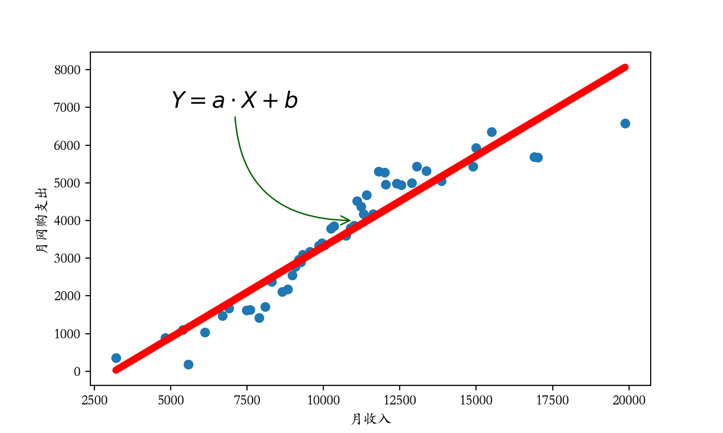 上面,我们已经确认了月收入和月网购支出之间存在强相关性,那么一个很自然的想法就是通过某人的月收入来预测他的月网购支出,反过来当然也是可以的。为了做到这一点,可以充分利用我们收集到的历史数据,让计算机通过对数据的“学习”获得相应的知识,从而实现对未知状况的预测。我们可以将上述数据中的 $\small{X}$ 称为自变量或特征(feature),将 $\small{y}$ 称为因变量或目标值(target),机器学习的关键就是要通过历史数据掌握如何实现从特征到目标值的映射。