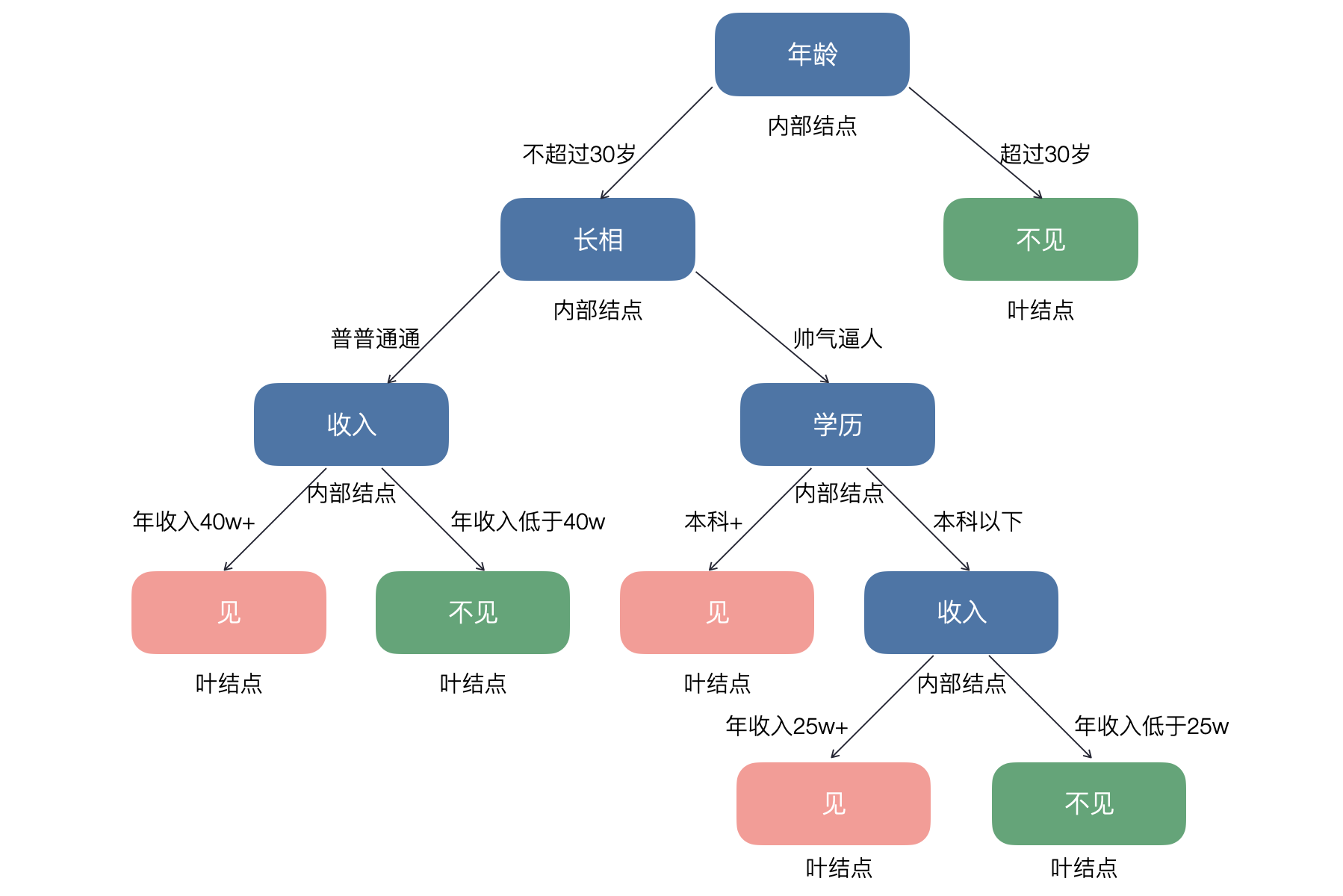 说明:上图仅用于帮助大家理解什么是决策树,无不良引导,也不代表本人的爱情观和婚姻观。