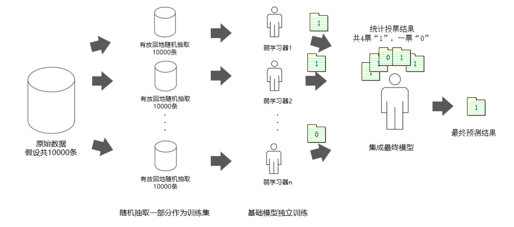 - Bootstrap 抽样:从原始训练数据集中随机抽取若干个样本(有放回抽样),形成多个不同的子集,每个子集用于训练一棵决策树。