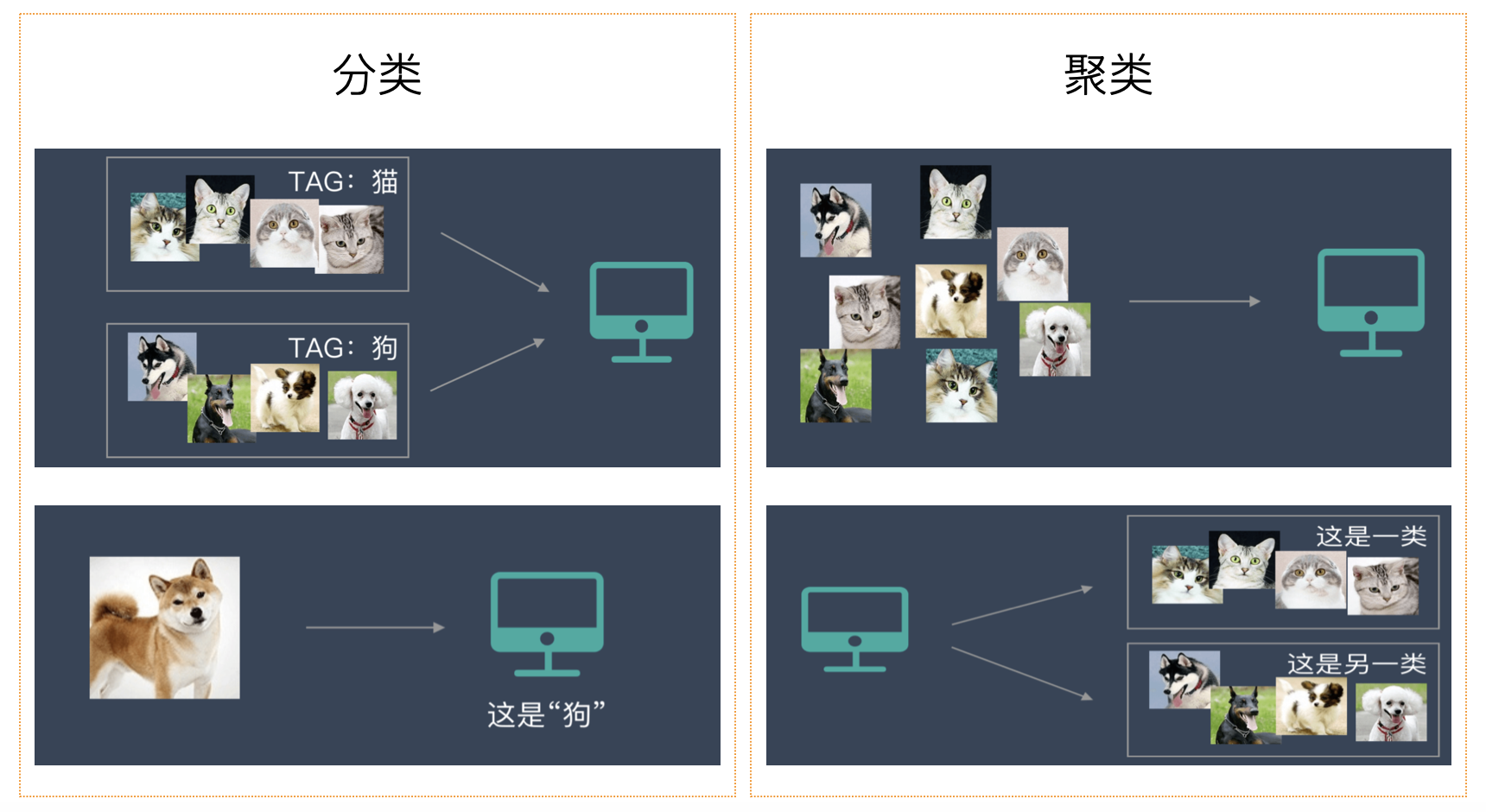 聚类是一种无监督学习,因为它不需要预先定义的标签,只是根据数据特征去学习,通过度量特征相似度或者距离,然后把已知的数据集划分成若干个不同的类别。与分类不同,聚类任务的目标是发现数据内在的结构。聚类算法大体上可以分为:基于距离的聚类、基于密度的聚类、层次聚类、谱聚类等。如果你还分不清楚聚类和分类到底有什么区别,相信下面的图可以帮到你。