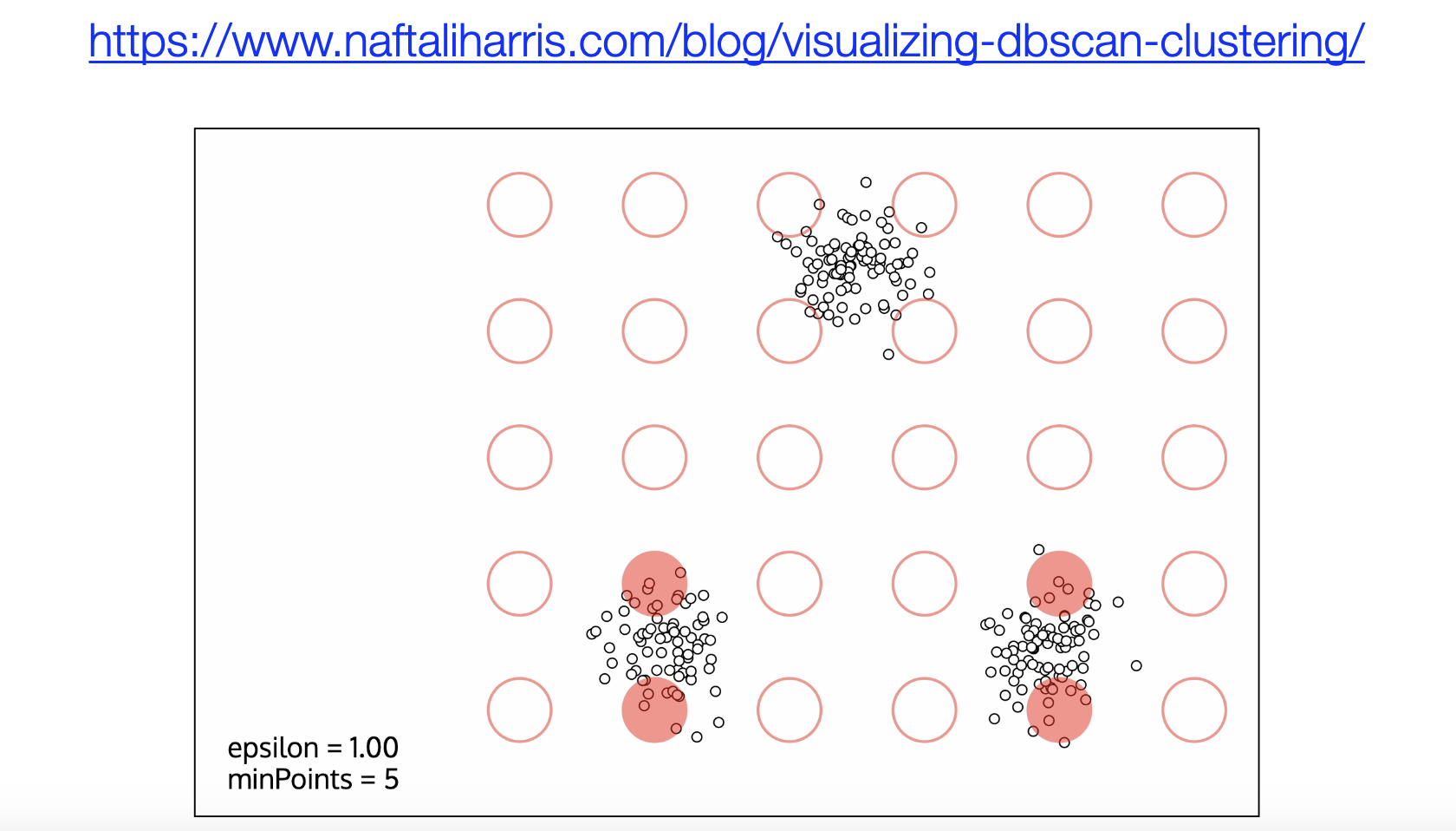 K-Means 是一种经典的聚类算法,它的优点包括实现简单,算法收敛速度快;缺点是结果不稳定(跟初始值设定有关系),无法解决样本不均衡的问题,容易收敛到局部最优解,受噪声数据影响较大。如果你想通过可视化的方式理解聚类的过程,我们给大家推荐一个名为 Naftali 的人的博客,该网站上提供了可视化的方式展示 K-Means 和 DBSCAN 聚类(一种基于密度的聚类算法),如下图所示。