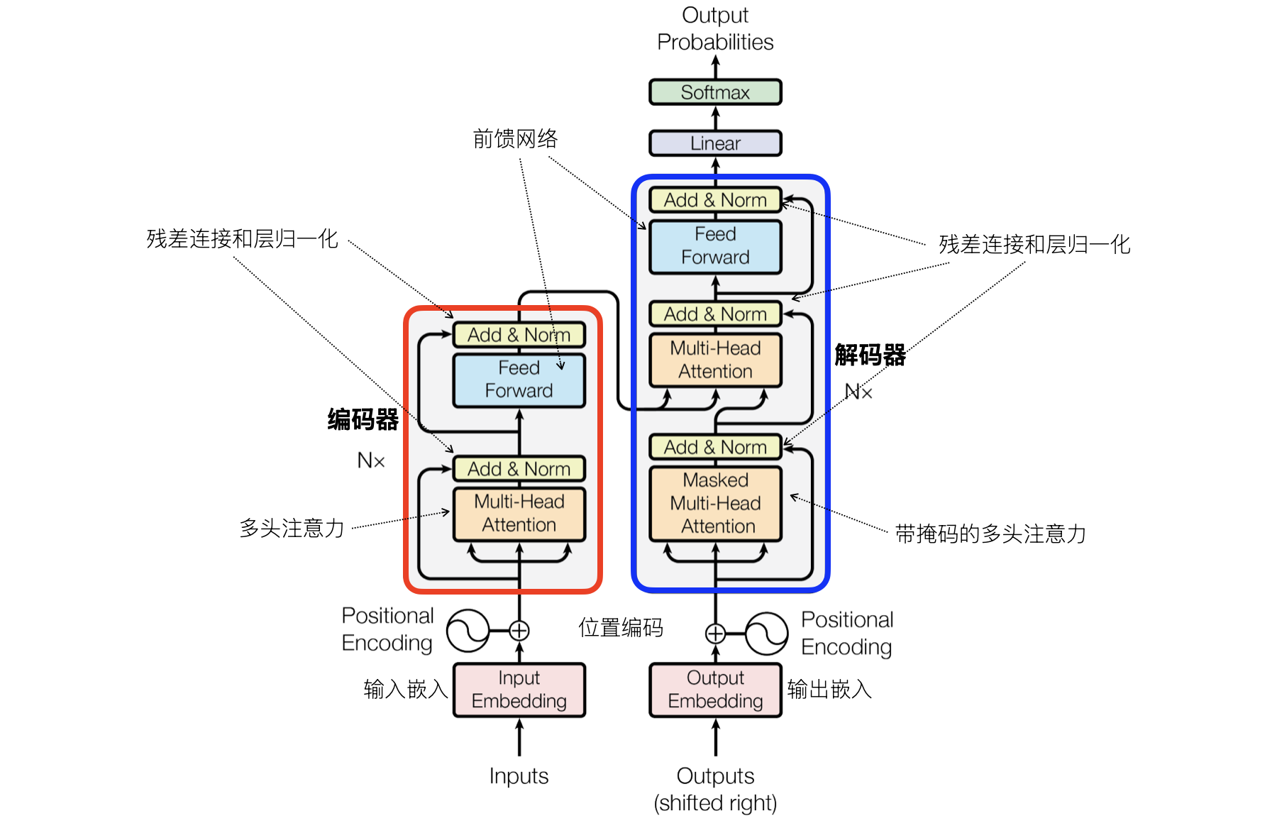 Transformer 架构如上图所示,它也是一个编码器-解码器结构,图左边部分红框中是堆叠的 N 组编码器,右边部分蓝框中是堆叠的 N 组解码器。编码器负责处理输入序列并将其转化为一个上下文相关的表示,解码器则根据编码器的输出生成目标序列(例如翻译任务中的目标语言)。下面,我们先简单说一下编码器和解码器的构成。